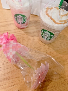誕生日プレゼントでね、ピンクのガーベラもらったんだ💐🩷 スタバと一緒に撮ってみた🥺 花言葉は、思いやり、感謝、愛、とか! 素敵だよね✨️
