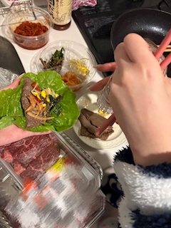 おはようございます!☀️ 今日もお昼から予定があるので なかなかちゃんとしたオフがない、、💧💧 この前おうち焼肉しました!😸💫 1回やってみたかったんだよね〜〜( ᴖ ̫ᴖ )⭐️ キッチンで焼いて、そのままキッチンで食べるの! おいしかったーーー!🥹🥹💡💡 ロピア(?)にお友達が買い出し言ってくれたんだけど、 お肉はもちろん、ナムルとかキムチおいしかった! キムチの種類いろいろあったらしくて、 買ってきてくれたのは、あさりキムチでした✨ 普通のスーパーには変わり種あんまり置いてないから ちょっとテンション上がったよね^^🎶
