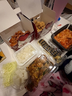 こんばんは🌛 月曜日お疲れ様でした🙂↕️🙂↕️ この前、お友達と 韓国料理ぱーちーした!!!⭐️⭐️⭐️ おいしかった幸せだった… :(˘•̥ㅁ•̥˘ ): 2人とも辛いの得意じゃないので、 チキンはチーズと甘辛のやつにした✋🏽💖 この日の垂れ流しテレビは 確かアンナチュラルだったはず!!(笑)(笑) お喋りしながら、たまにドラマみながら、 がいちばんの幸せですね🥹⭐️ スンドゥブは、辛すぎて ふたりでチーズどはどば投入して食べました🧀 おやすみなさい💤💤