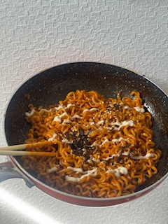 おはようございますあこです🍀 今日のお昼はねーーー これ! ブルダック!!🔥 最近食べてなかったから急に食べたくなって 最後の一袋開けちゃった🌟 見た目汚いけどちゃんと美味しかったよ!!!