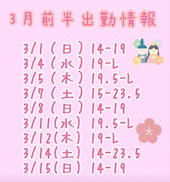 あきなです🎀 3月!☀️🌸 出勤予定のせます! よろしくお願いします✨