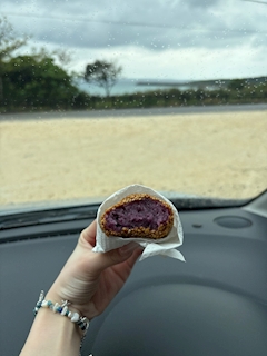 おはようございます! 天気悪かった日ですが、 紅芋もちを食べに行きました!!! めちゃくちゃおいしかったこれ!!!! 作ったブレスレットと共に🫶🏼🫶🏼