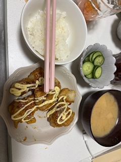 こんばんはー!みゆです! 今日の夜ごはん! 照りマヨチキン作ったよー! 片栗粉沢山まぶしたので カリカリで美味しかった(՞ o̴̶̷̤ ̫ o̴̶̷̤ ՞)