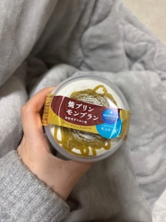 こんばんはー!みゆです! 見てこれ〜🥺 焼きプリンモンブランっていう すばらしい名前のものを スーパーで見つけた✨ 1日の〆に 最高🥺